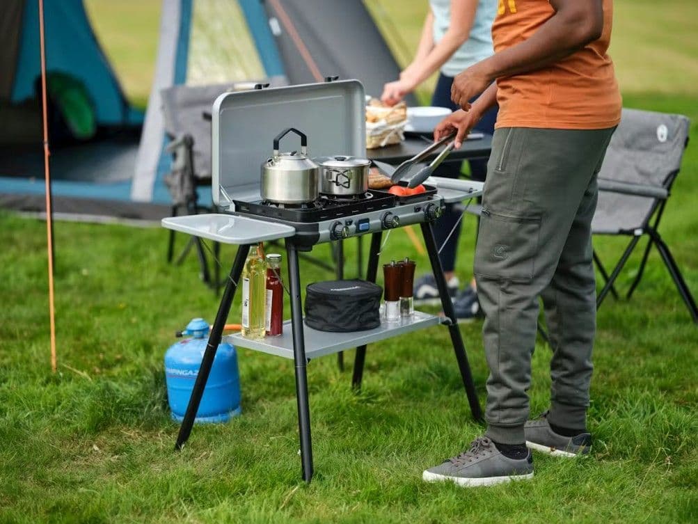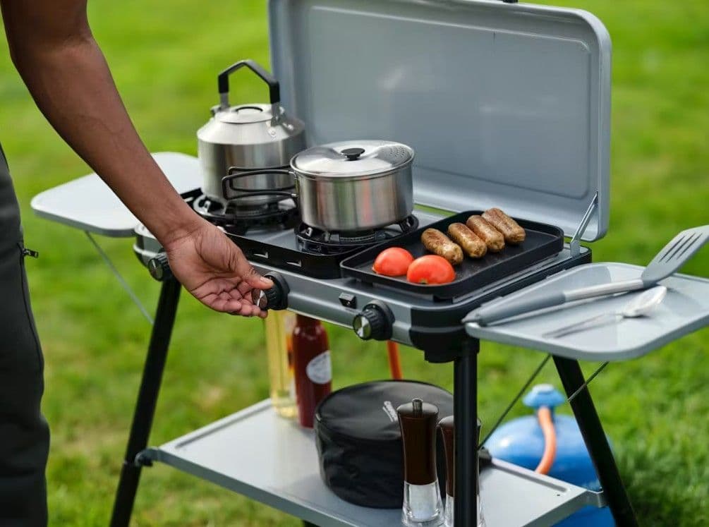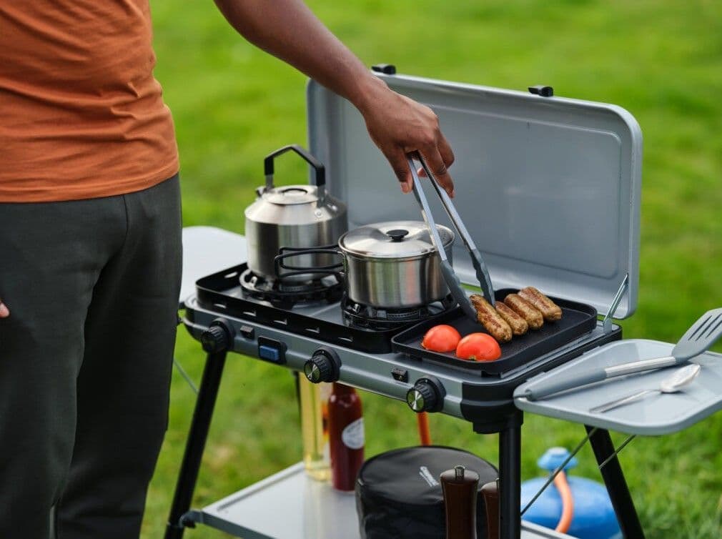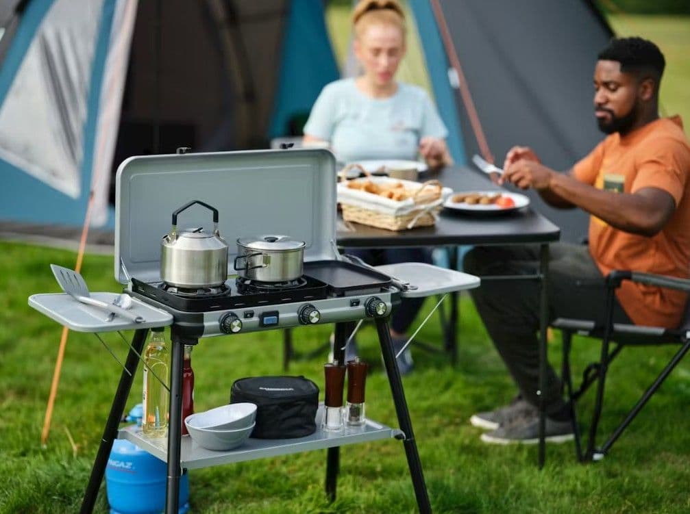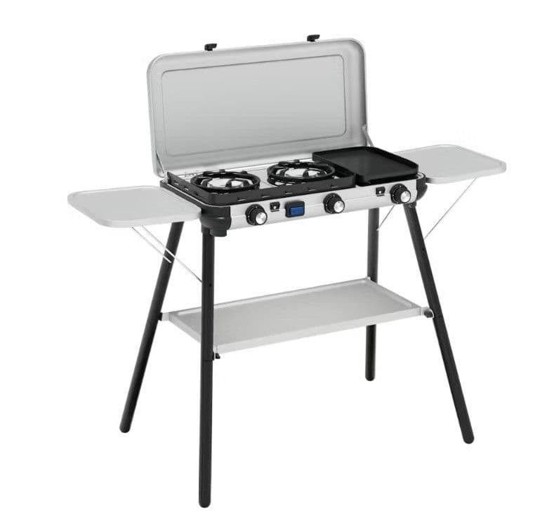 The Camping Kitchen 2 Multi-Cook Plus stove combines cooking and grilling in one, with three independent burners allowing to individually control your heat. Simultaneously boil, saute’, and toast for a hot and timely served meal. Even when the weather is unpredictable, the burners’ FLAMEGUARD technology is designed for optimal flame protection for the best outdoor cooking experience. Not only is cooking all-in-one, but so is portability. With reinforced hinges connecting the lid to base, the entire stove becomes its own case for clean and quick packing before and after your trip. Pan supports and grilling plate are all removable for easy clean-up. With 2 optional cooking set-ups, you may either place the lightweight barbecue on any table-top or if table space is limited, quickly click in your steel legs and the side tables and condiment shelf, and your stove is ready to start grilling.