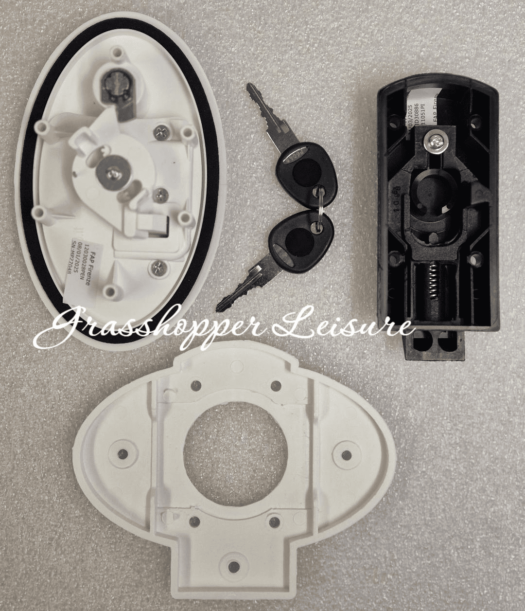 FAP Flap Lock "Fish" without Hook - 1203KITSG1028N. Widely used lock system seen on many motorhomes. Comes complete with FAP new system barrel and 2 keys. System available with or without security.