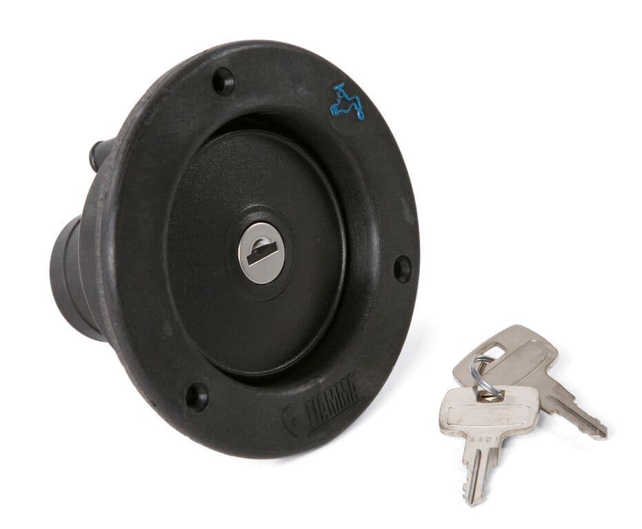 The new updated Fiamma inlet features a cover over the key socket. It has a lockable cap and accepts the 40mm flexible hose, to connect to a water tank in a caravan, campervan or motorhome. Complies with European closure system standards.