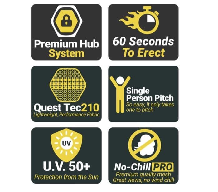 The Quest Pop Up Screen House 4 gives you a huge amount of usable space as the sides spring out ensuring you can use 100% of the space inside. The screen walls help stop those pesky insects getting in and help to keep the wind at bay but allows airflow to keep it cool. In sunny weather the UV coating and shade from the roof along with the screened sides, actually make the inside of the screen house cooler than outside. Easy to put up, just as easy to take down and pack away, the Screen House is the perfect addition to any outdoor living space. It is both shelter from bad weather, shade from good weather and added privacy when you need it.