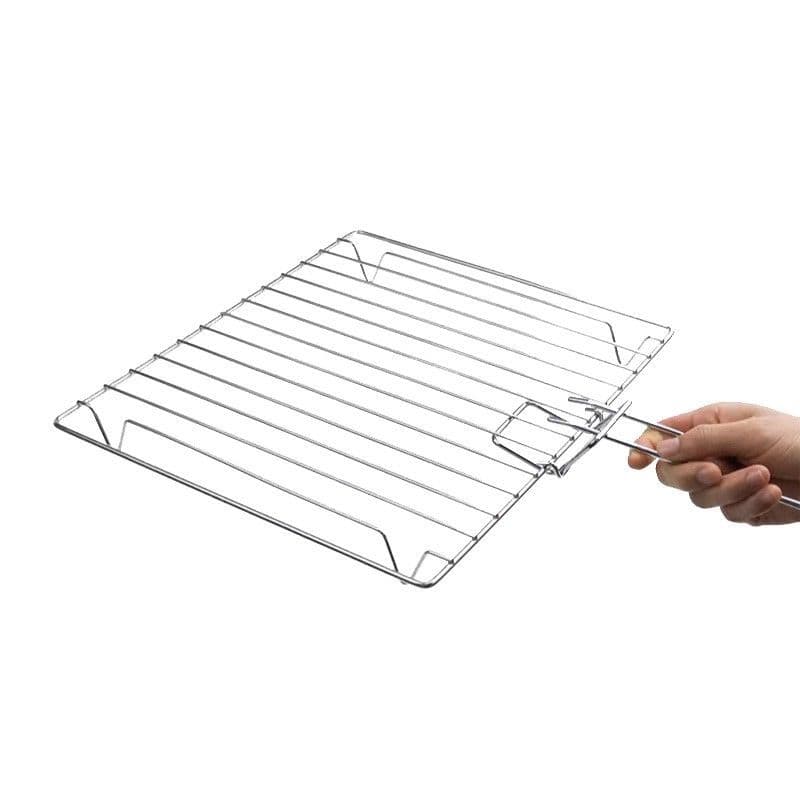 - Includes cooking grill and baking tray with removable handle